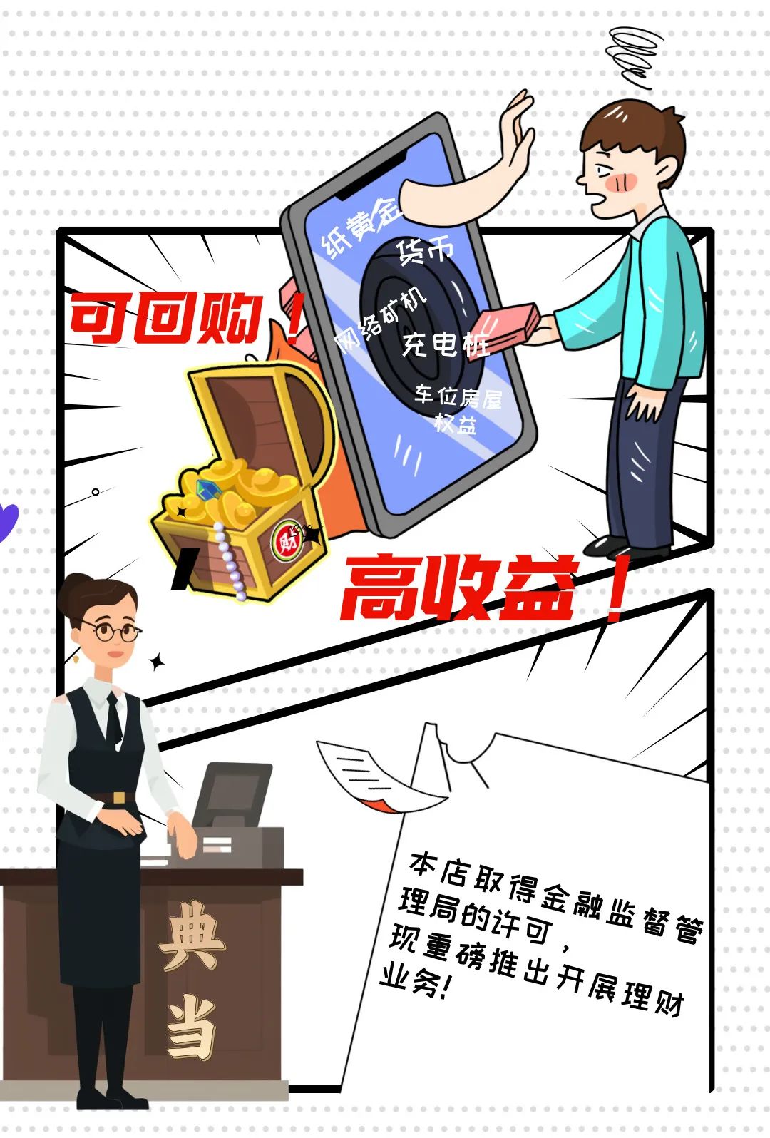 这种模式以销售商品为名,典当行占有客户资金之实,迷惑性较大。这里的“纸黄金”和正规银行销售的正规“纸黄金”产品不是一回事,正规“纸黄金”产品不会保本回购,更不会约定收益率,其金价是随国际金价走势变动而变动的。