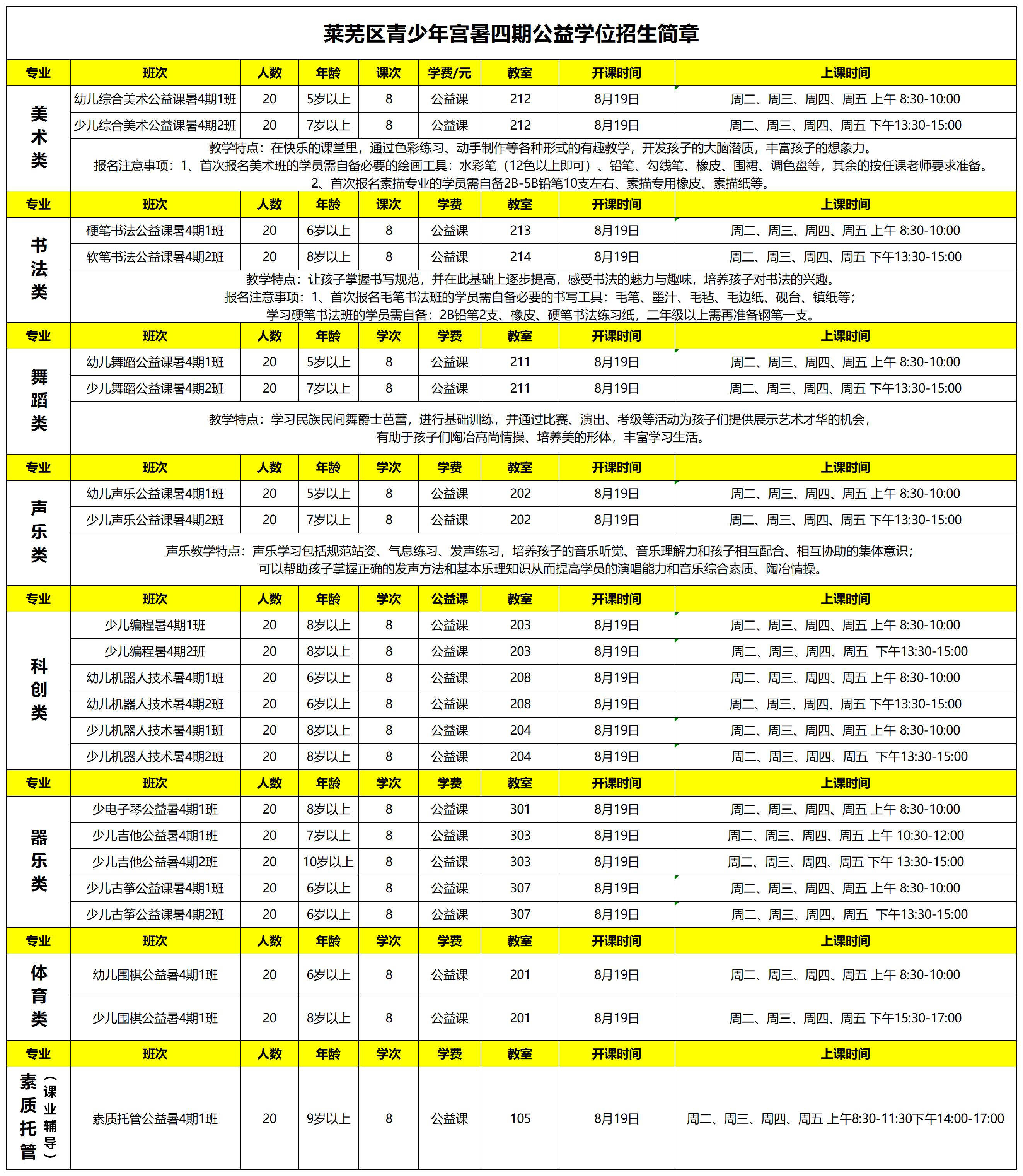 (5)莱芜区青少年宫开展的暑期、秋季公益课程均为公益性质(课程免费)。所有参加者均为自愿参加,风险与责任自负。