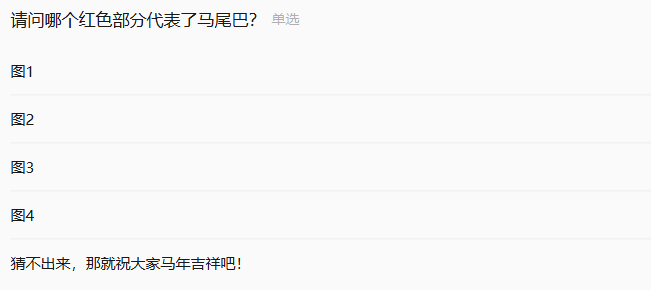 “马”字繁体写作“馬”,它是一个典型的象形字。我们先来做个小游戏:请猜猜看,如果参照甲骨文中“马”字的结体分析,下面四个“馬”,哪个红色部分代表了马尾巴呢?