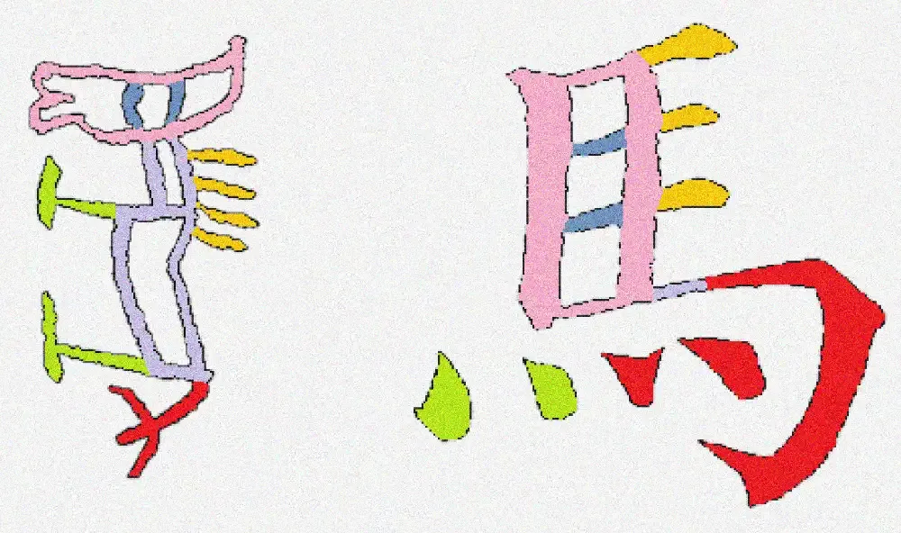 “馬”字一般按本图红、黄、蓝、绿、紫的顺序书写。本图由人工智能工具Gemini 3润色过。