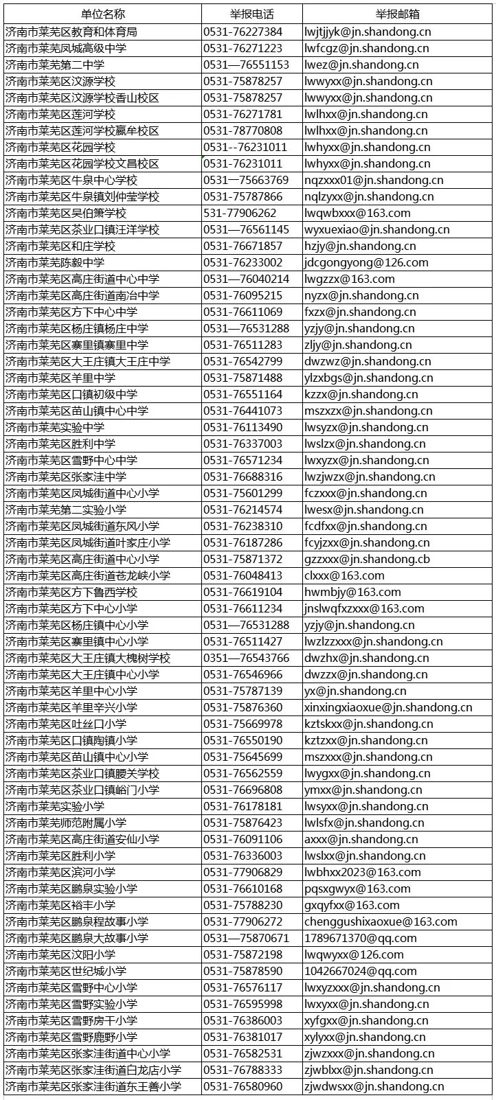 为进一步规范中小学办学行为,贯彻落实中央、省、市“双减”“五项管理”有关政策要求,促进青少年学生身心健康成长,莱芜区教育和体育局现面向社会公布全区中小学校违规办学行为监督举报电话和邮箱,欢迎各位家长和社会监督。